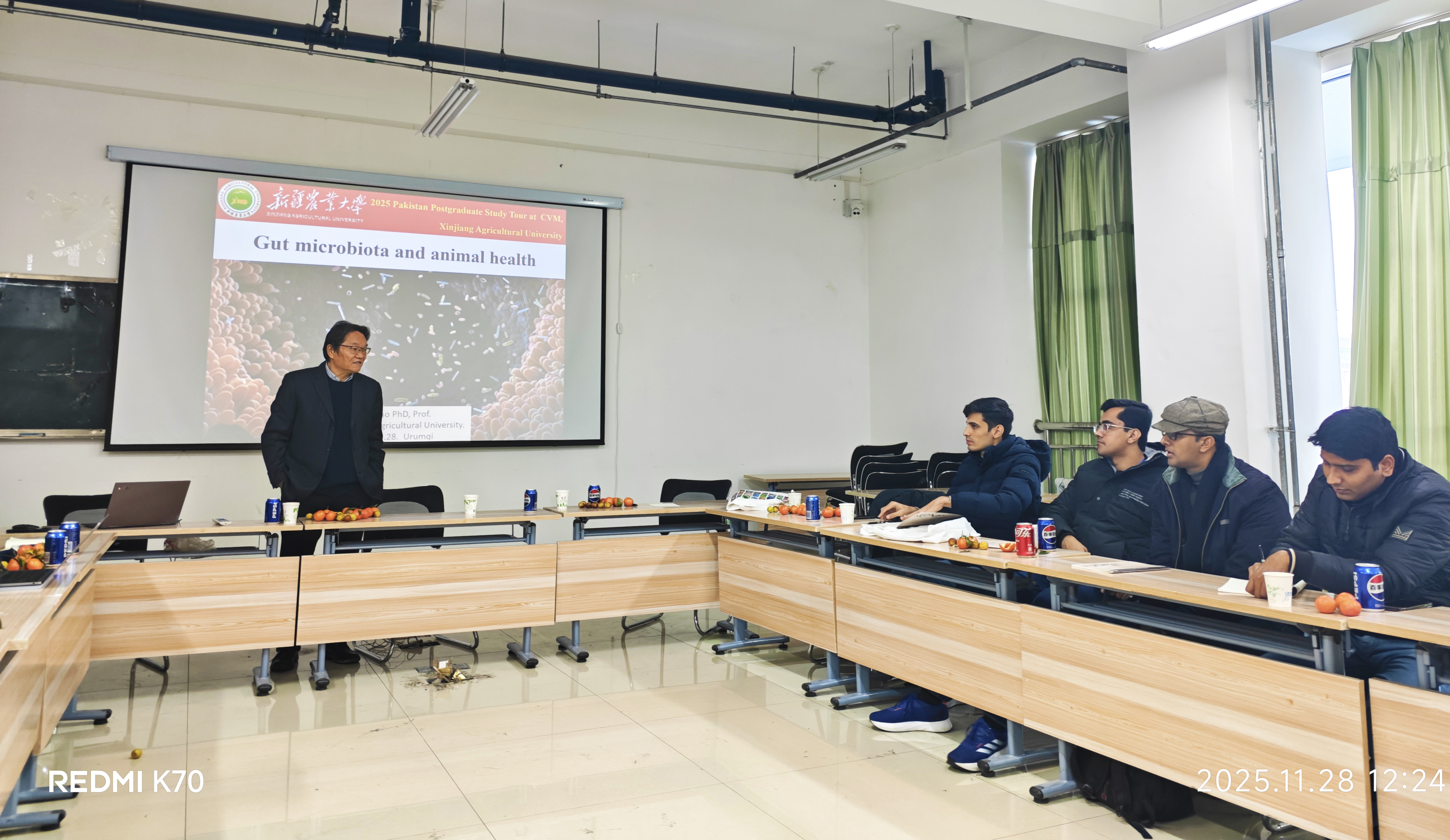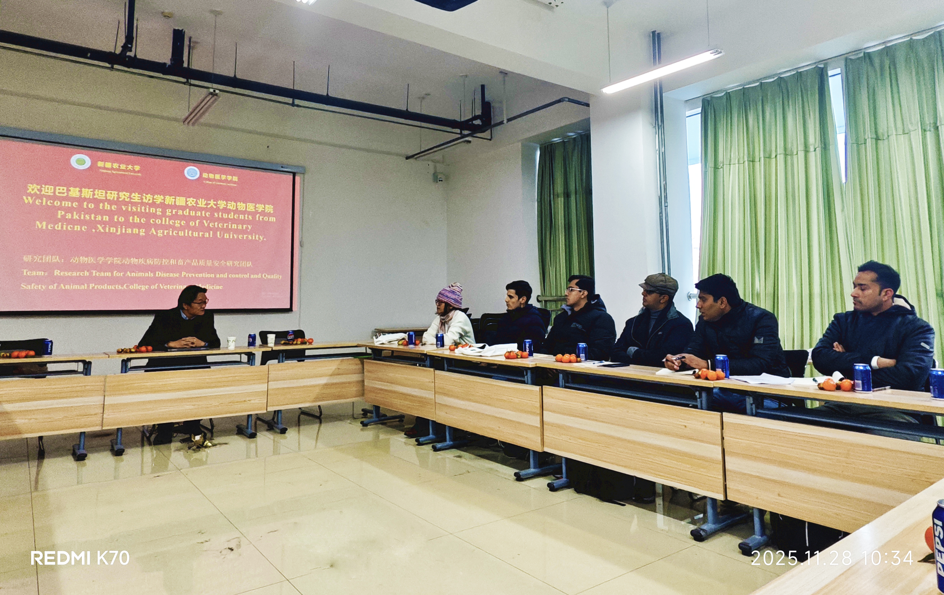 2025年11月28日,一场高水平的国际学术交流活动在我院成功举行。本次活动汇聚了学界与业界的杰出代表,包括我院姚刚教授、新疆天莱农牧集团股份有限公司副总裁兼总畜牧师陈如龙、教师吾买尔江·牙合甫、七位巴基斯坦访问学者,以及我院畜产品质量与安全团队的博硕士研究生。各方围绕动物医学前沿热点议题,展开了一场深度与广度兼具的对话。