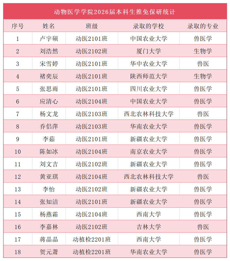 金秋时节,硕果盈枝。近日,全国各高校硕士研究生推免工作陆续结束,动物医学学院优秀学子捷报频传,推免工作取得丰硕成果。据统计,本届我院共有18名优秀本科生成功获得推免资格,将被厦门大学、吉林大学、中国农业大学、南京农业大学、西北农林科技大学、华中农业大学、新疆农业大学等高校录取,继续深造。