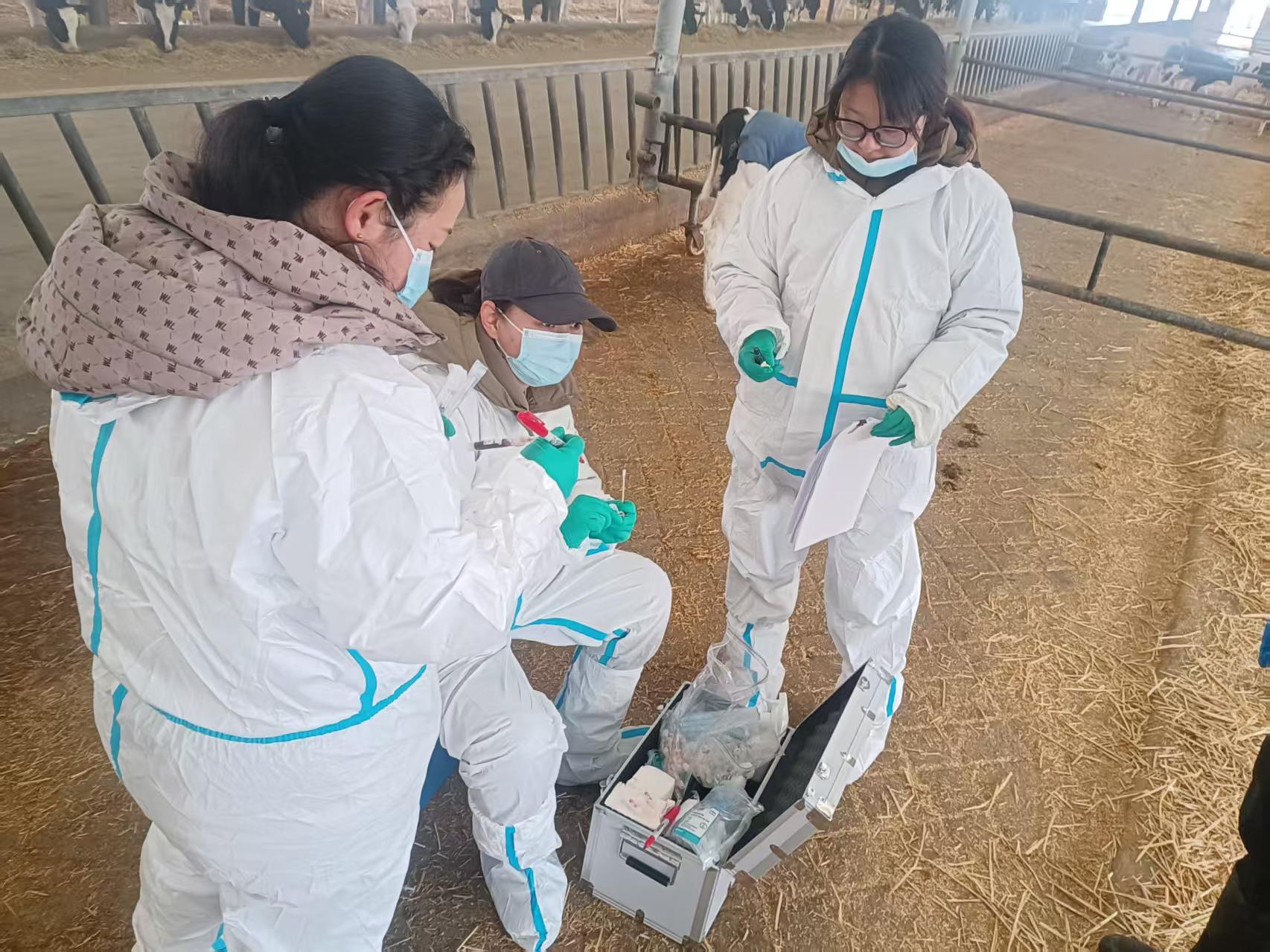培训讲座结束后,为进一步将理论知识转化为实践助力,马雪连副教授带领动物保健与畜产品质量安全团队成员蒋倩、谭杨,前往呼图壁奶牛场6场开展实地工作,现场对病牛进行采样,为后续疫病防控及减抗用药建设提供了数据支撑。