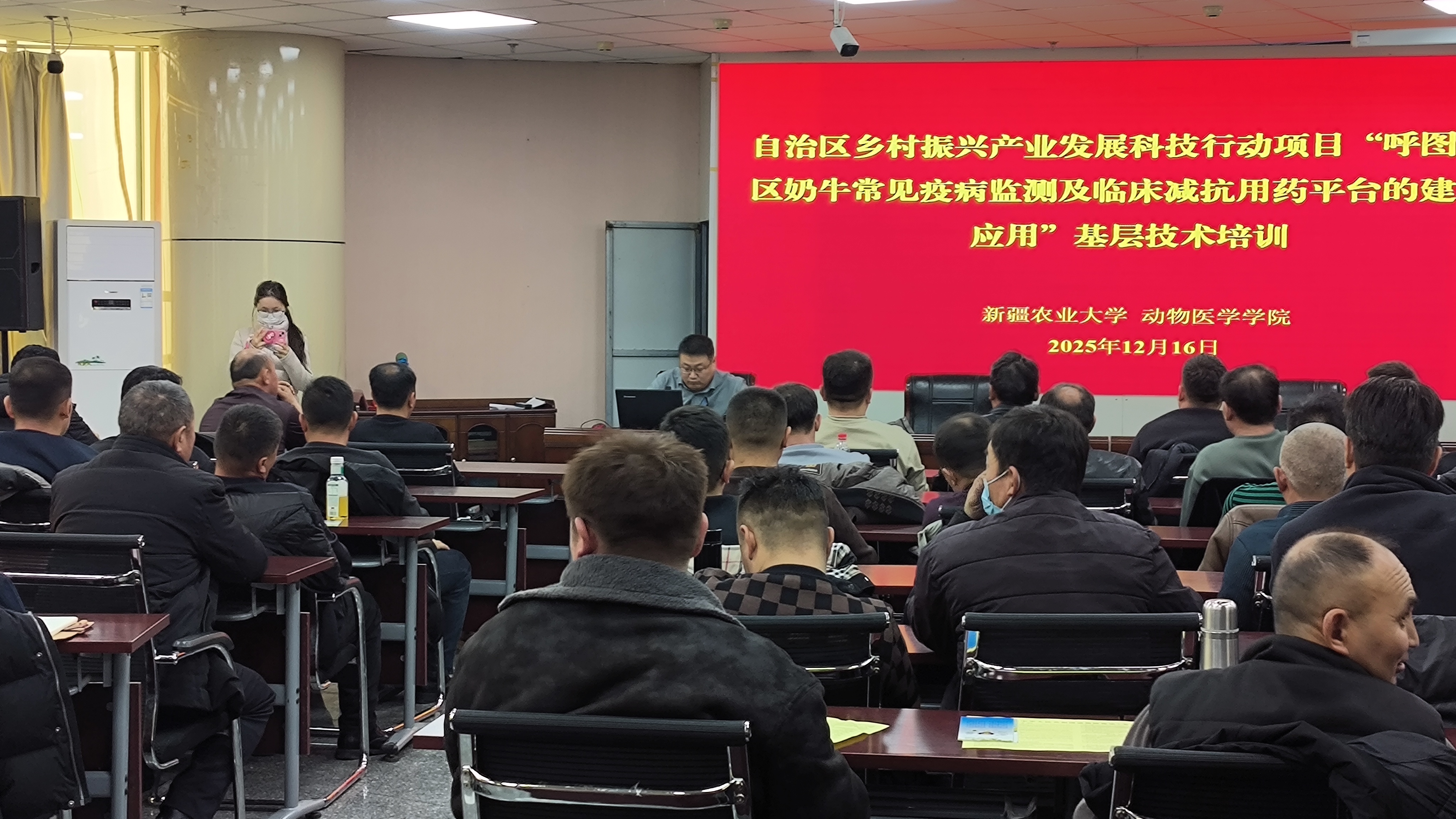 为推动自治区乡村振兴产业发展科技行动落地,提升基层奶牛养殖从业者疫病防控与科学用药能力,2025年12月16日上午,由新疆农业大学动物医学学院主办的“呼图壁县奶牛常见疫病监测及临床减抗用药平台的建立与应用”基层技术培训顺利举办。