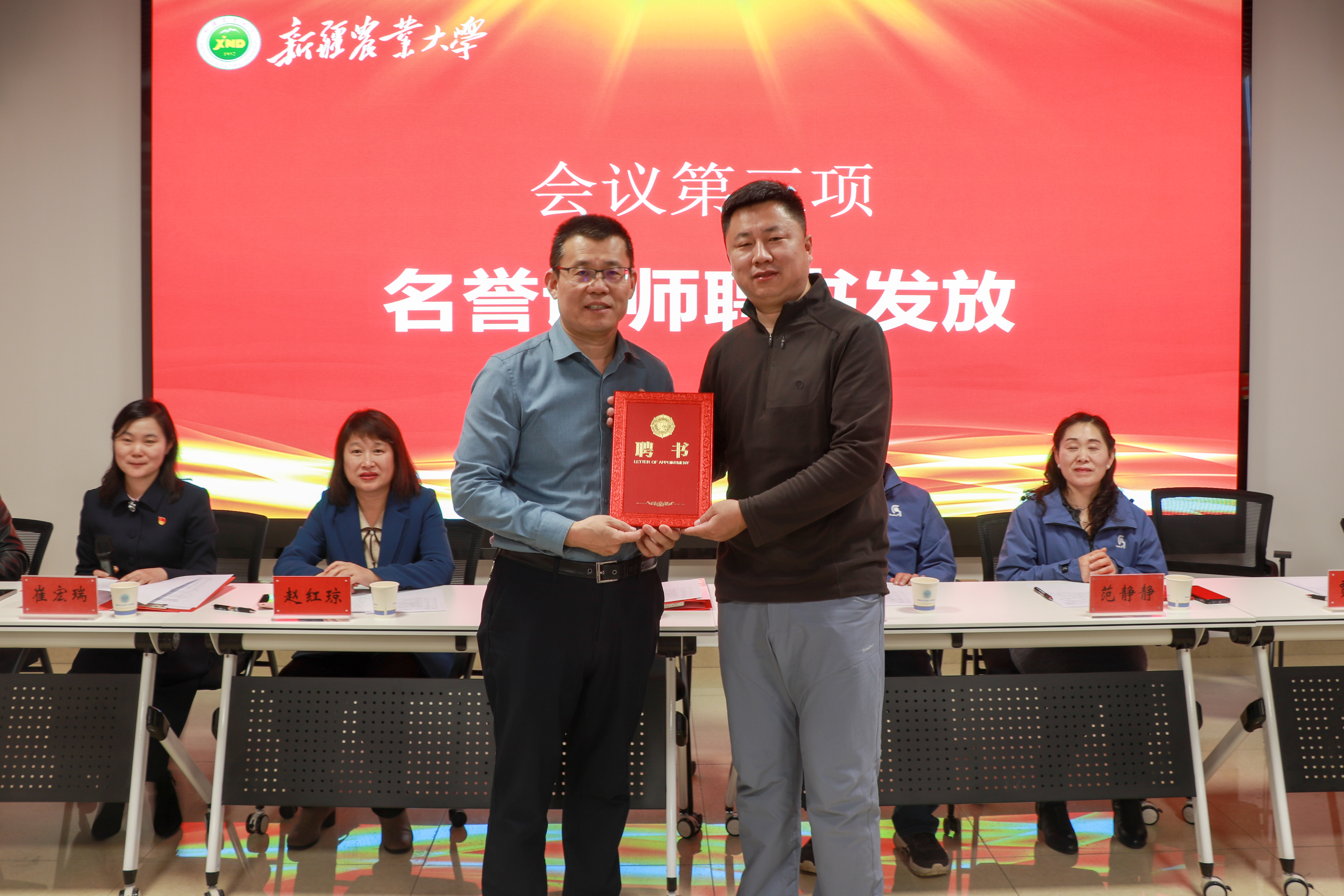 聘任环节同样亮点纷呈,主持人介绍了瑞派艺泽连锁宠物医院贾新生院长的行业背景与专业成就后,郭庆勇院长为其颁发校外名誉讲师聘书。贾新生院长现场简短发言,分享了自己的行业见解与教学热忱,他表示将充分发挥行业一线经验优势,为学院实践教学添砖加瓦。随后,新疆农业大学教务处副处长赵红琼作总结发言,肯定了此次设备捐赠与人才引进的双重价值,并展望了校企合作与教学发展的广阔前景。