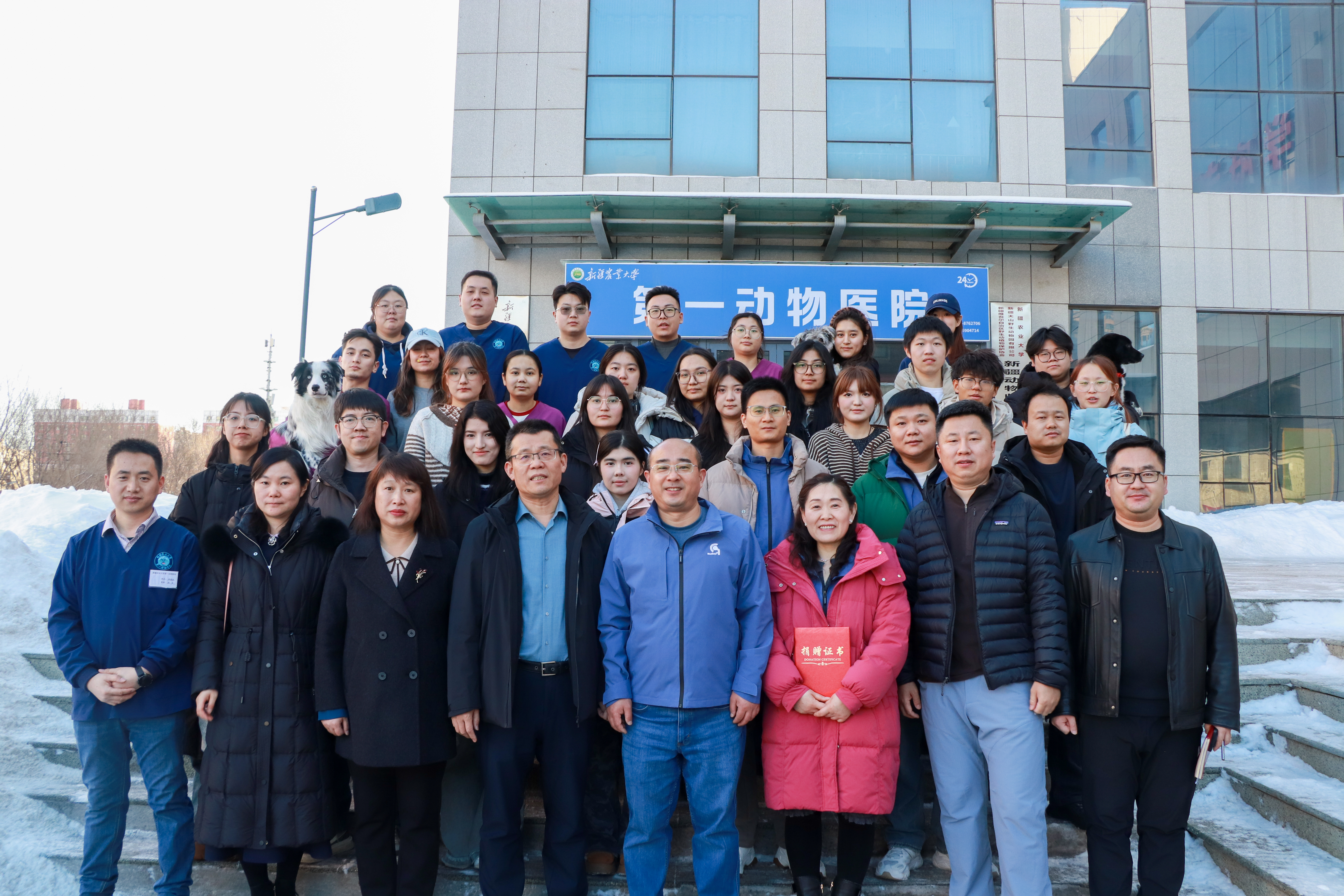 仪式尾声,捐赠方、校方与新任校外讲师三方代表合影留念,全体到场人员也共同拍摄大合影记录这一重要时刻。此后,在张伟副院长与新疆农大第一动物医院院长李建龙的陪同下,嘉宾们参观了学院实验室与第一动物医院,开展自由技术交流与实地观摩,进一步深化了校企双方的沟通与了解。