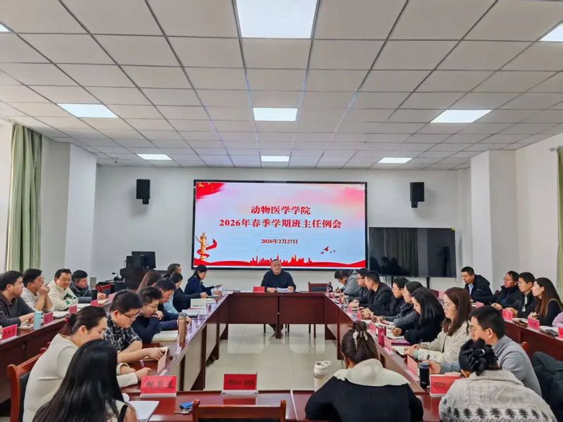 为全面夯实新学期学生管理基础,压紧压实班主任工作责任,筑牢校园安全稳定防线,2026年2月27日下午,动物医学学院召开2026年春季学期班主任例会。此次参会的有动物医学学院党委书记吐尔逊江•斯迪克、动物医学学院党委副书记、纪委书记崔宏瑞、动物医学学院副院长付强、动物医学学院副院长张伟、学院辅导员以及全体班主任。